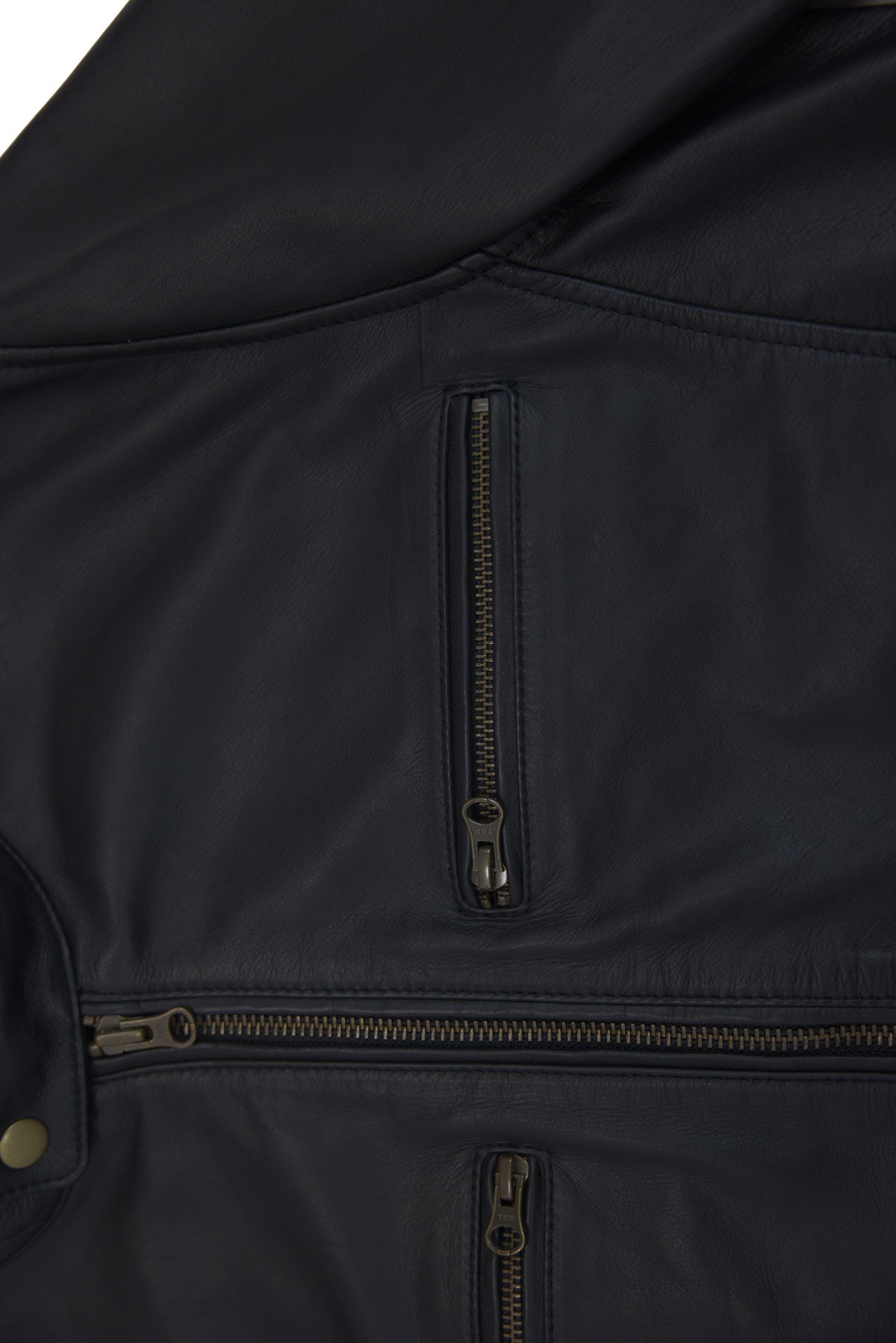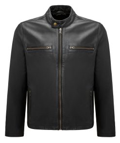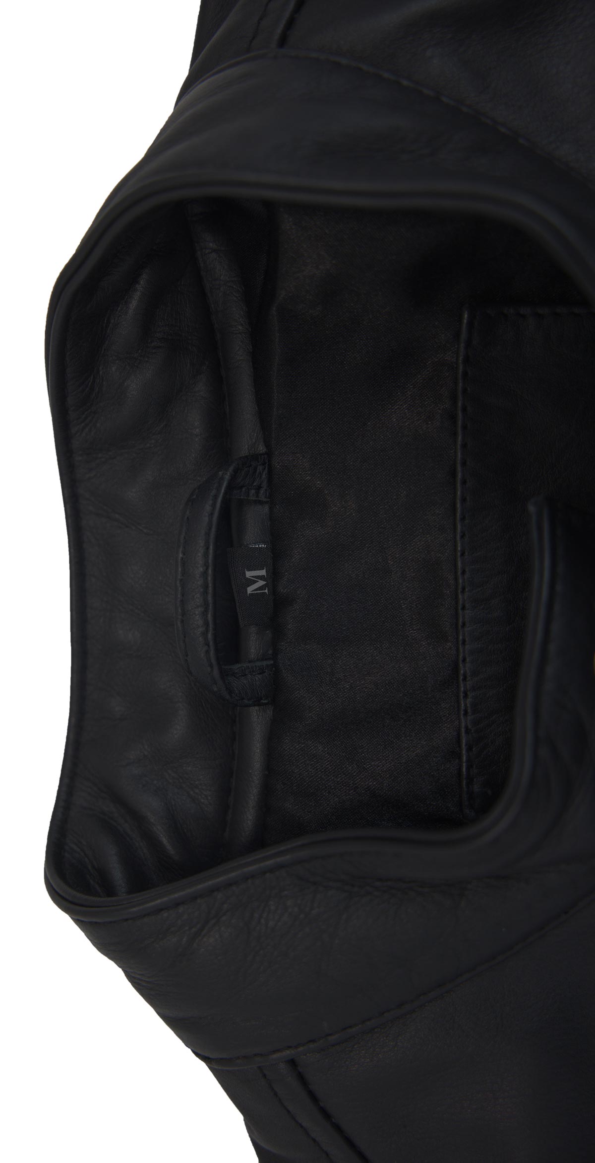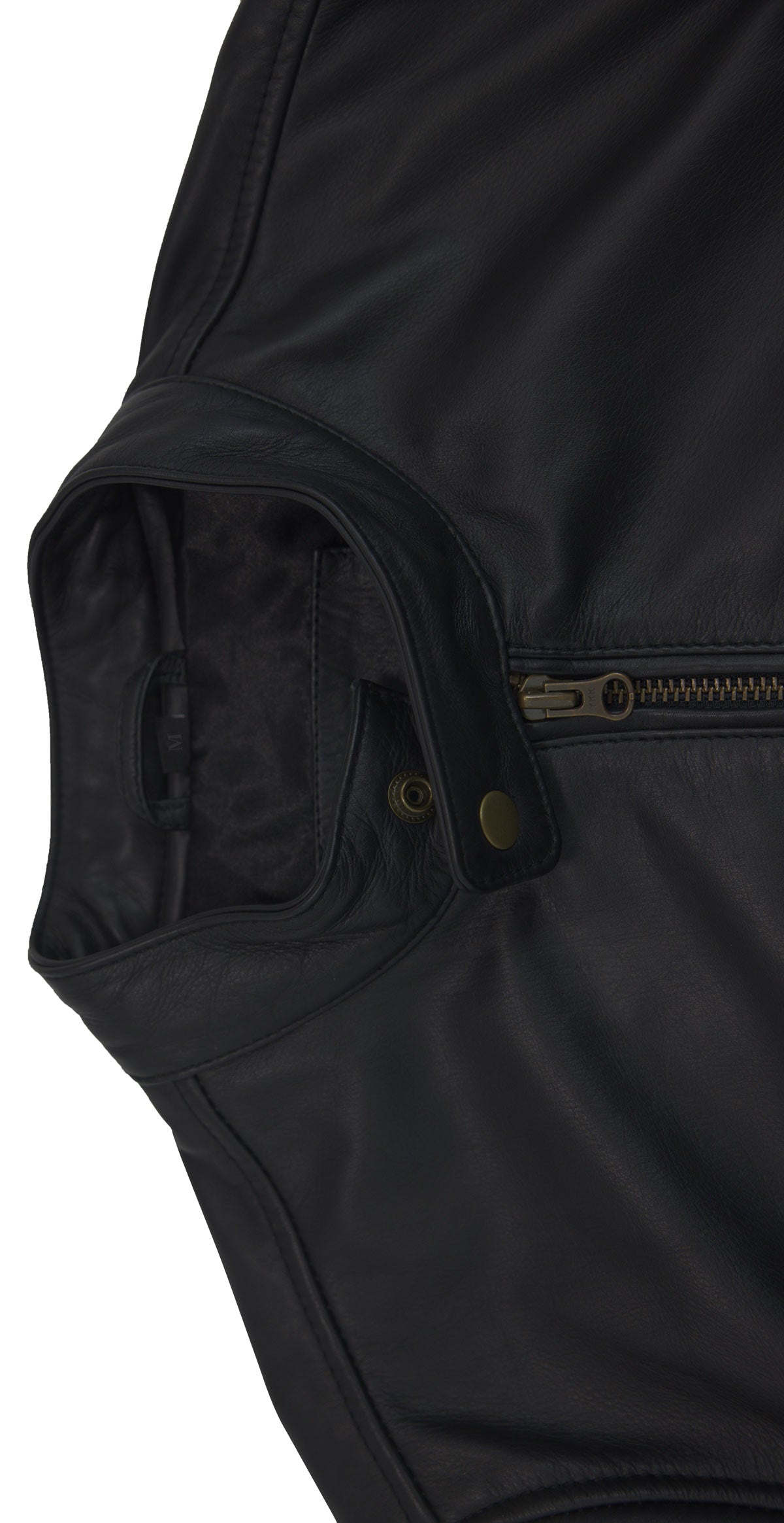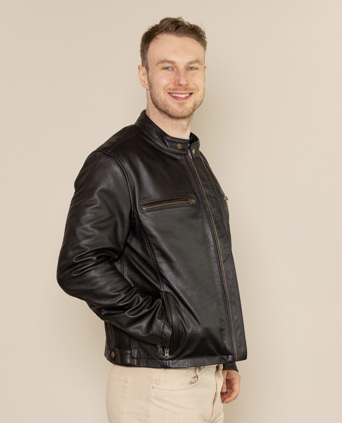 This stylish black leather jacket combines modern design with practical features. It has two hip pockets and two additional pockets at the top, providing you with plenty of storage space. The zipper in the middle can be opened from both the top and bottom, providing additional flexibility. The collar is equipped with a snap button closure for a secure fit.