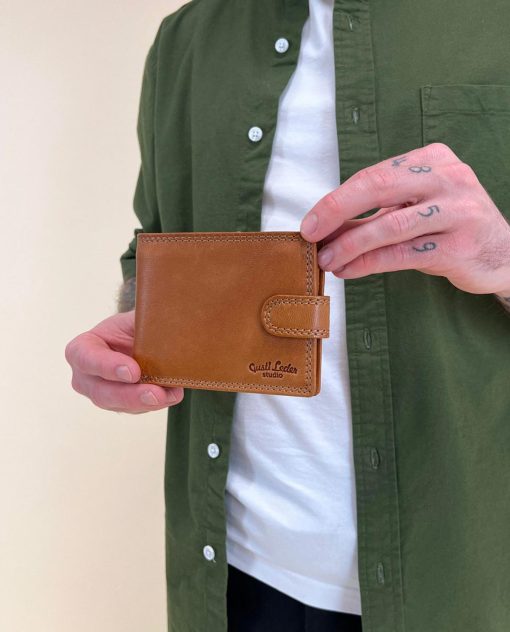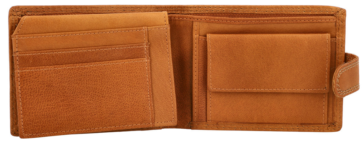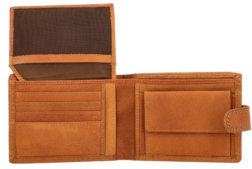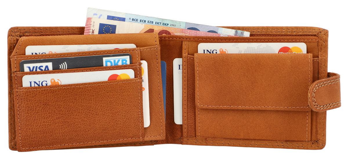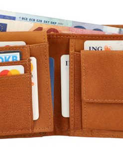 Inside, you are entitled to maximum comfort in functionality. The smart organization system helps you to have your most important cards, IDs, coins, and bills quickly and easily at hand. Where at first glance there doesn’t seem to be much space, there is more available than you think. Folding techniques and pockets allow you to store everything you imagine. A viewing window with dimensions of 10.5 x 6.5 cm allows you, for example, to show your monthly pass without having to take it out first. The cowhide is high-quality processed and extremely robust. It offers you and your wallet great shape stability and promises that you will enjoy this great product for a long time. A snap button connected with a tab closes the wallet easily and uncomplicatedly.