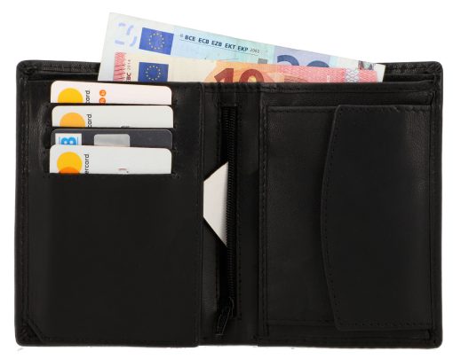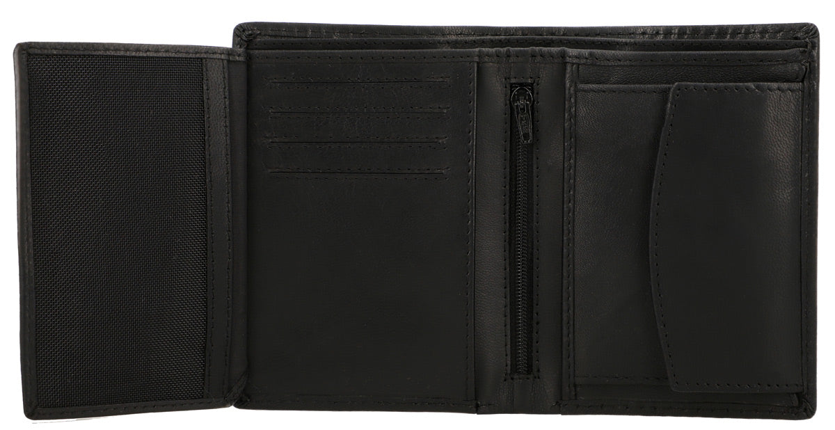 Inside, this wallet has a spacious, well-thought-out layout with two pockets for notes, a separate coin pocket secured with a press button, and 8 card slots for at least 8 cards. The integrated fold-out pocket folds out to reveal a large viewing window, where you can keep your I.D., driving license, or even photos of loved ones safe. This wallet also has a great additional feature; the small, zipped compartment, where you can keep your valuables safe, and the two small side pockets behind the coin and card pockets.