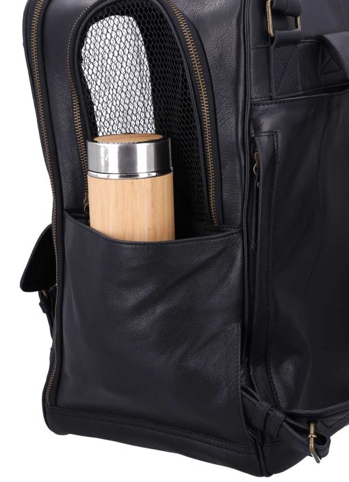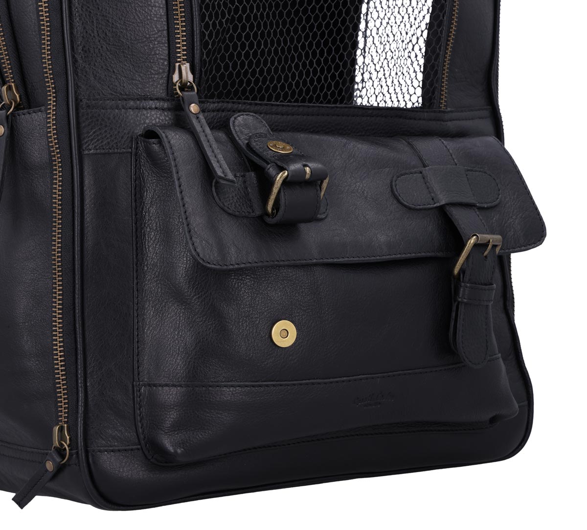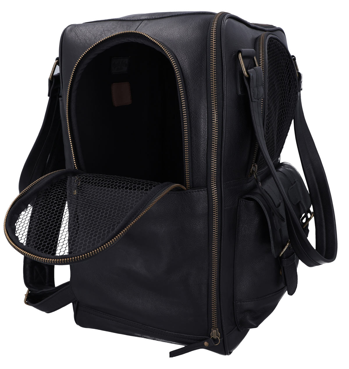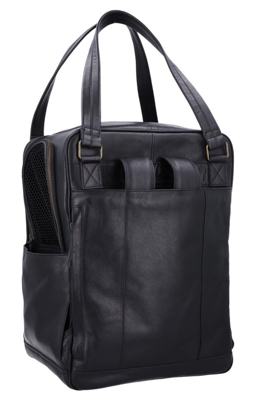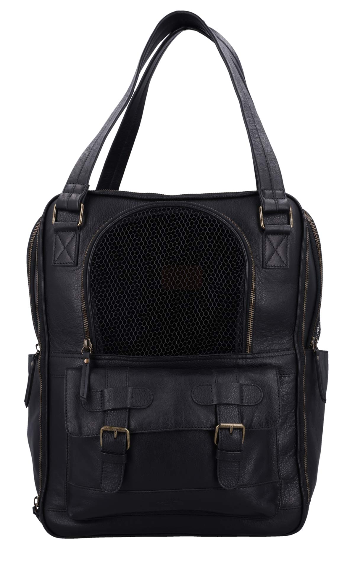 The “Madox” is the perfect solution for all pet owners who want to transport their pets safely and stylishly. This pet transport backpack made of high-quality black leather combines functionality with an elegant design. You can carry the backpack either as a backpack or a bag, offering you maximum flexibility in everyday life. The thoughtful construction allows your pet to breathe easily, as parts of the bag are equipped with mesh fabric that ensures good ventilation.