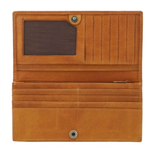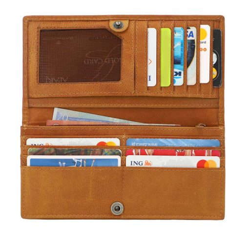 “Pia” really draws on the full range of superlatives that it combines. The ultra-fine grain durable leather gives this stylish accessory a beautiful and elegant look. The zipped pocket on the back of the purse is the perfect place to keep your smaller belongings, the things you need close at hand. You can store your notes, coins, and cards inside this spacious purse. This purse folds down and is secured with a press button. It has a spacious zipped coin pocket, as well as four note compartments and 14 card slots.