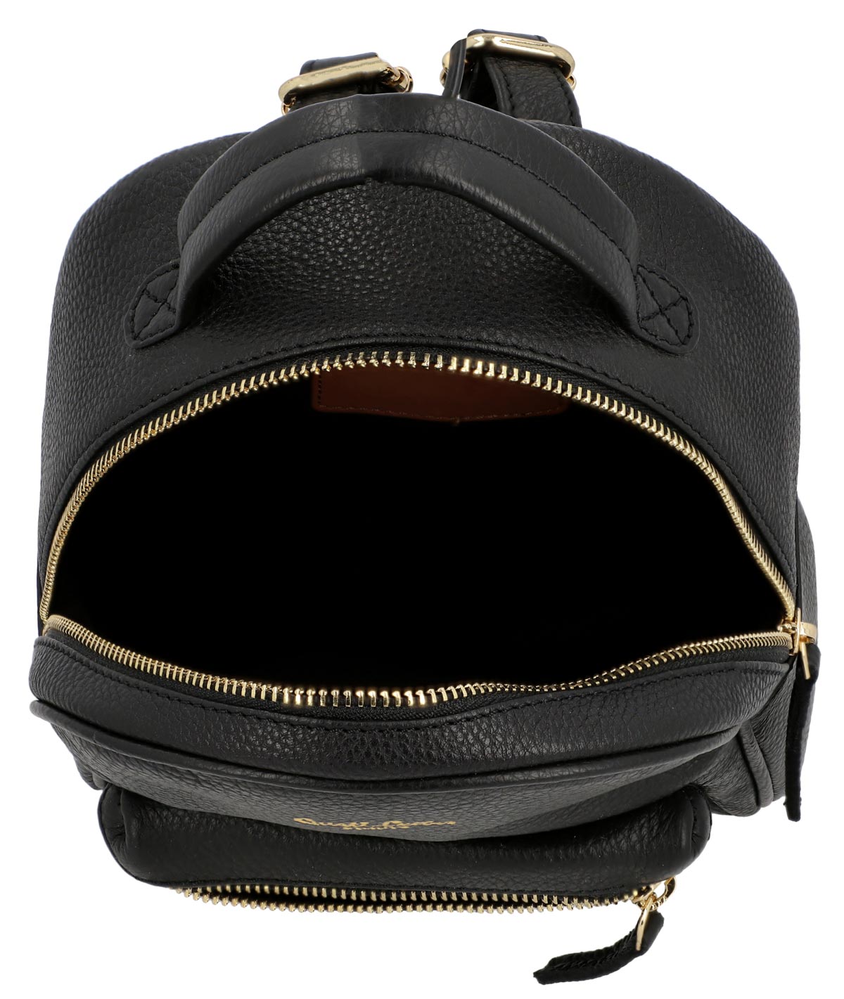 “Wendy” is subtle and sophisticated, the perfect bag for your daily routine. The gold detailing is expertly placed on the rich black cowhide leather, so this backpack seamlessly transitions from daywear to evening wear. “Wendy’s” 5-litre capacity means you have more than enough space for your essentials: make-up, keys, diary, and purse. There’s an extra zipped pocket on the front of the bag for things you need easy access to. The perfect place for your phone or notepad. The comfortable adjustable straps add the final finishing touch to “Wendy”, so you can wear her all day long without any aches and pains.