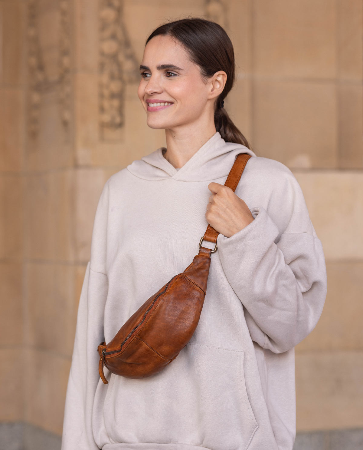 Handbag too big but pockets not big enough? We’ve got the perfect solution. “Cillian” can go with you to events where a big bag would just get in the way. Who wants to wear a crossbody bag to a concert? Handbags just get in the way when you’re dancing! “Cillian” helps you keep your essentials close by. There’s plenty of space in this cowhide leather belt bag for your phone, keys, and cash. Wear it around your waist or casually over your shoulder. It’s up to you! “Cillian’s” minimalist design means you can wear this practical, yet stylish, bag with any outfit. Summer’s on the way. So get ready for your next festival!