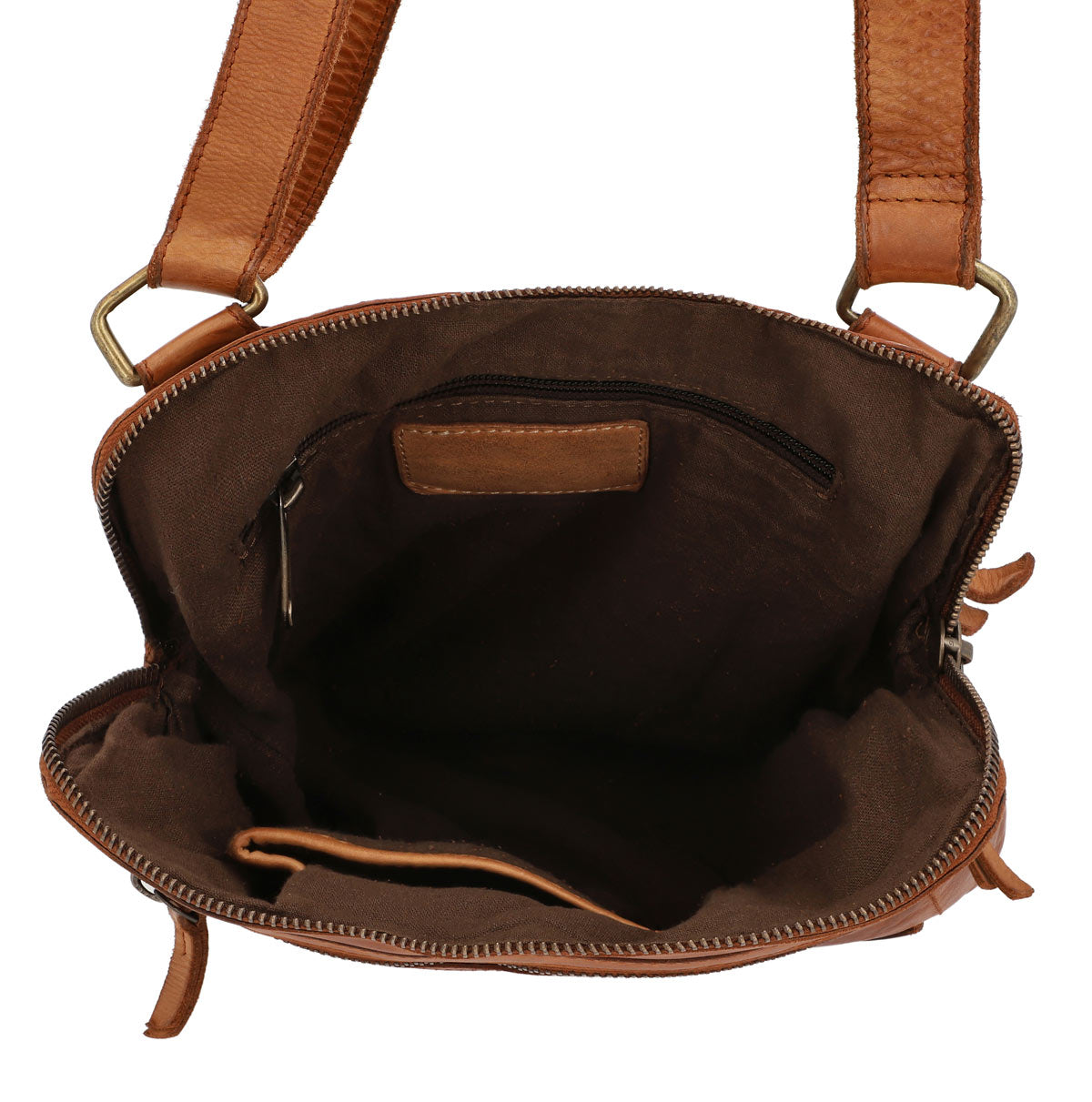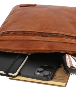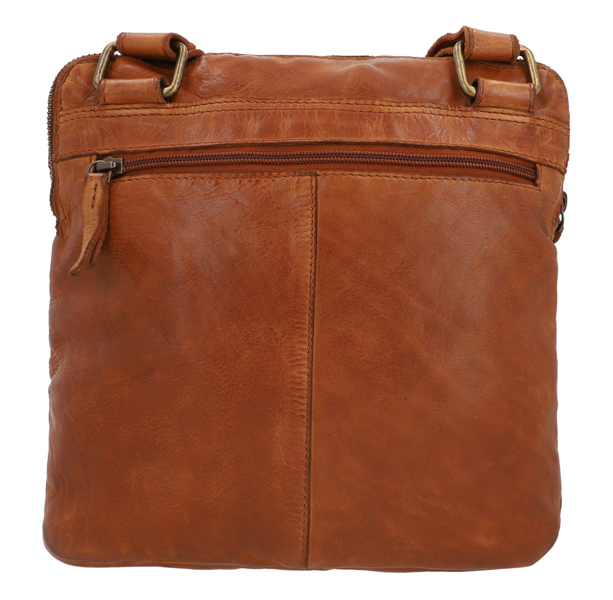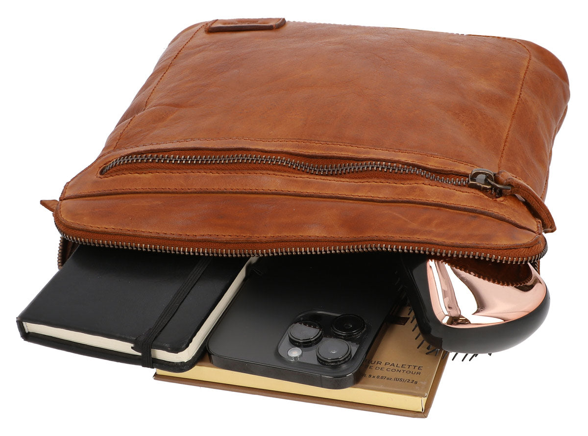 This leather bag combines functionality with classic design. In addition to the spacious main compartment, it has two zippered pockets, one on the front and one on the back. These practical pockets allow you to store your items neatly and accessibly. Carry it comfortably over the shoulder or in hand and enjoy the versatility and elegance of this bag. Experience the high-quality craftsmanship and stylish look that becomes more beautiful over time.