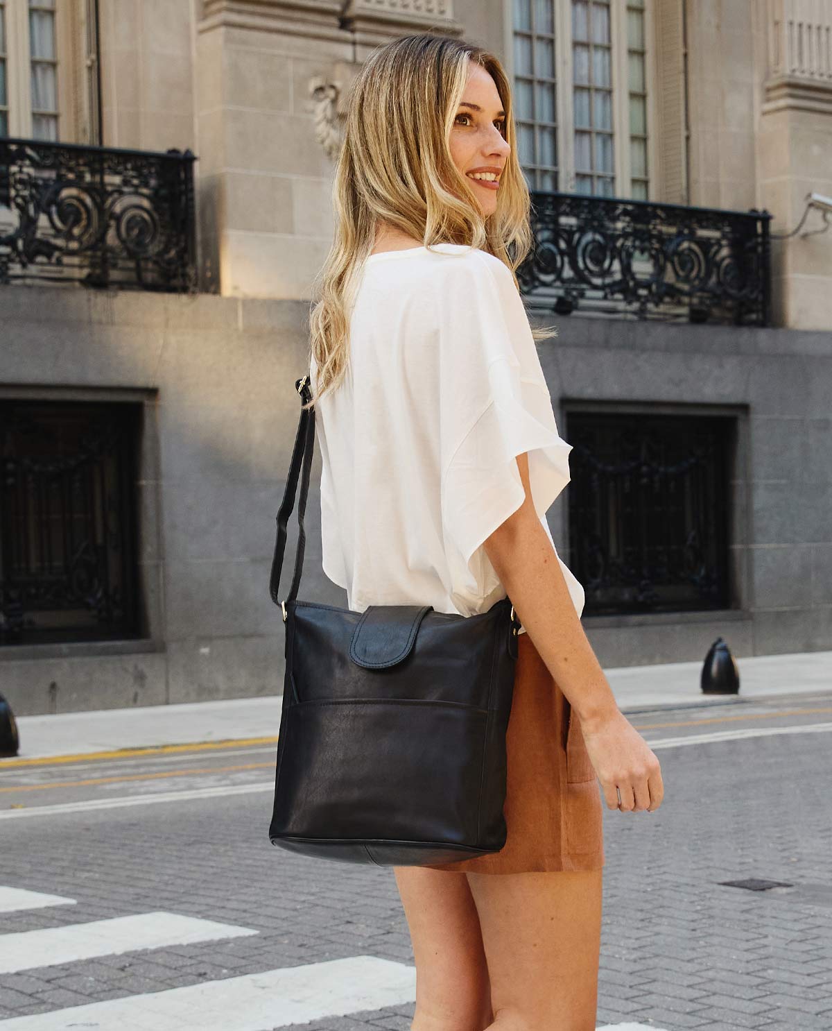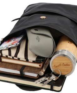 The main compartment in this shoulder bag is secured using a sturdy zip, so none of your belongings can go missing. “Jacqueline” has an extra tab that’s secured with a magnetic popper. So, you’ll have plenty of space for your water bottle, purse, notebooks, keys, and makeup. There’s an extra zipped pocket on the front of the bag where you can keep your phone, headphones, or gum.
