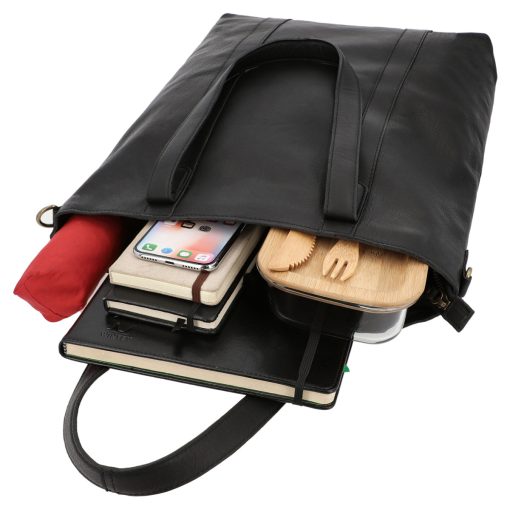 “Paris” might not look like the biggest bag, but she’s actually super spacious! Who would have thought that a small laptop could fit into this compact tote bag? If you’d rather work from a café than at home, “Paris” is the perfect companion! You don’t have to lug a bulky laptop bag around anymore; you can fit your laptop in your handbag. The soft buffalo leather gives this bag a cool vintage look, so you’ll always look good when you’re on the go! There are multiple small pockets inside where you can keep your belongings safe. Throw the long strap over your shoulder and off you go. Additionally, the long, detachable shoulder strap offers even more carrying comfort – perfect for wearing it comfortably over your shoulder or across your body, depending on your mood and preference! To top it off, “Paris” is available in elegant black or casual brown.
