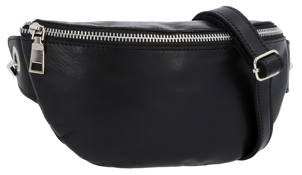 This stylish black leather belt bag is the perfect accessory for men and women