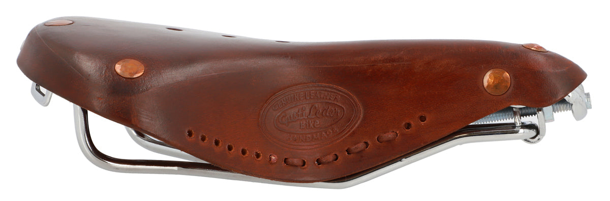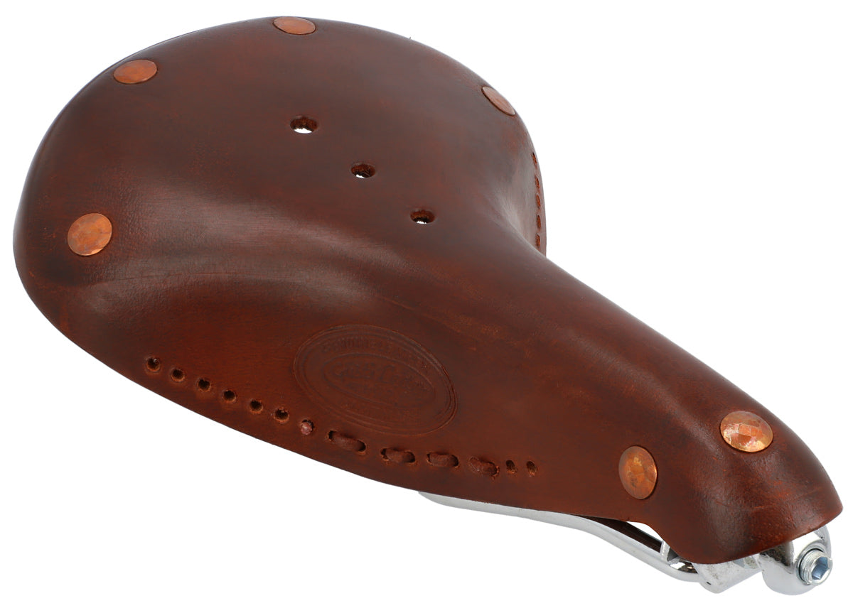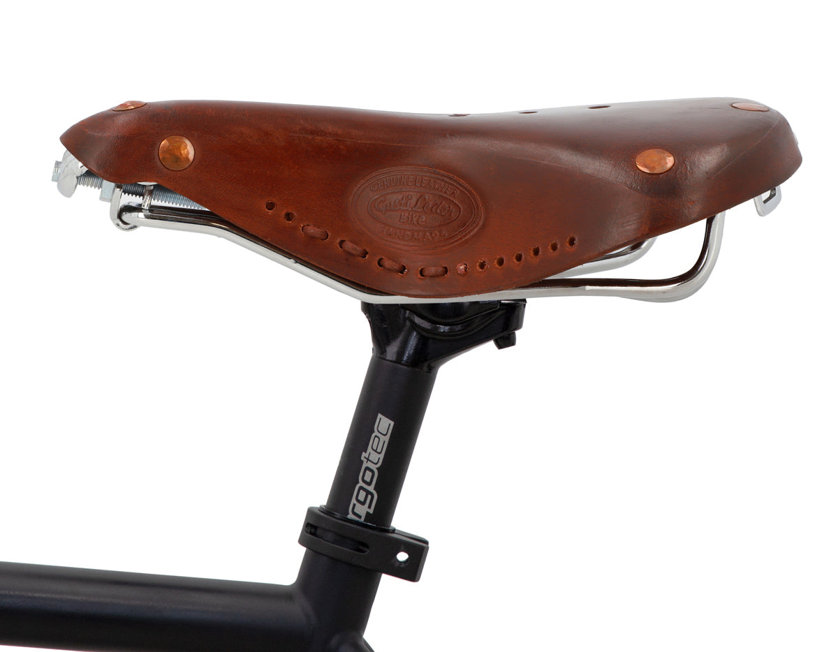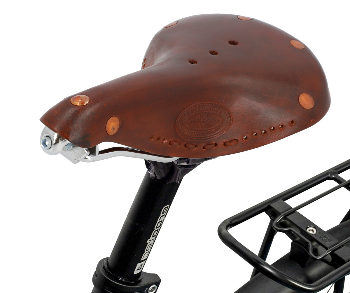 This robust buffalo leather saddle has rivets around the edge, so you can comfortably screw the saddle in and hit the road. “Angelo D.” has eyelets on the back so that you can attach a saddle bag and have even more freedom when you’re out on a bike ride.