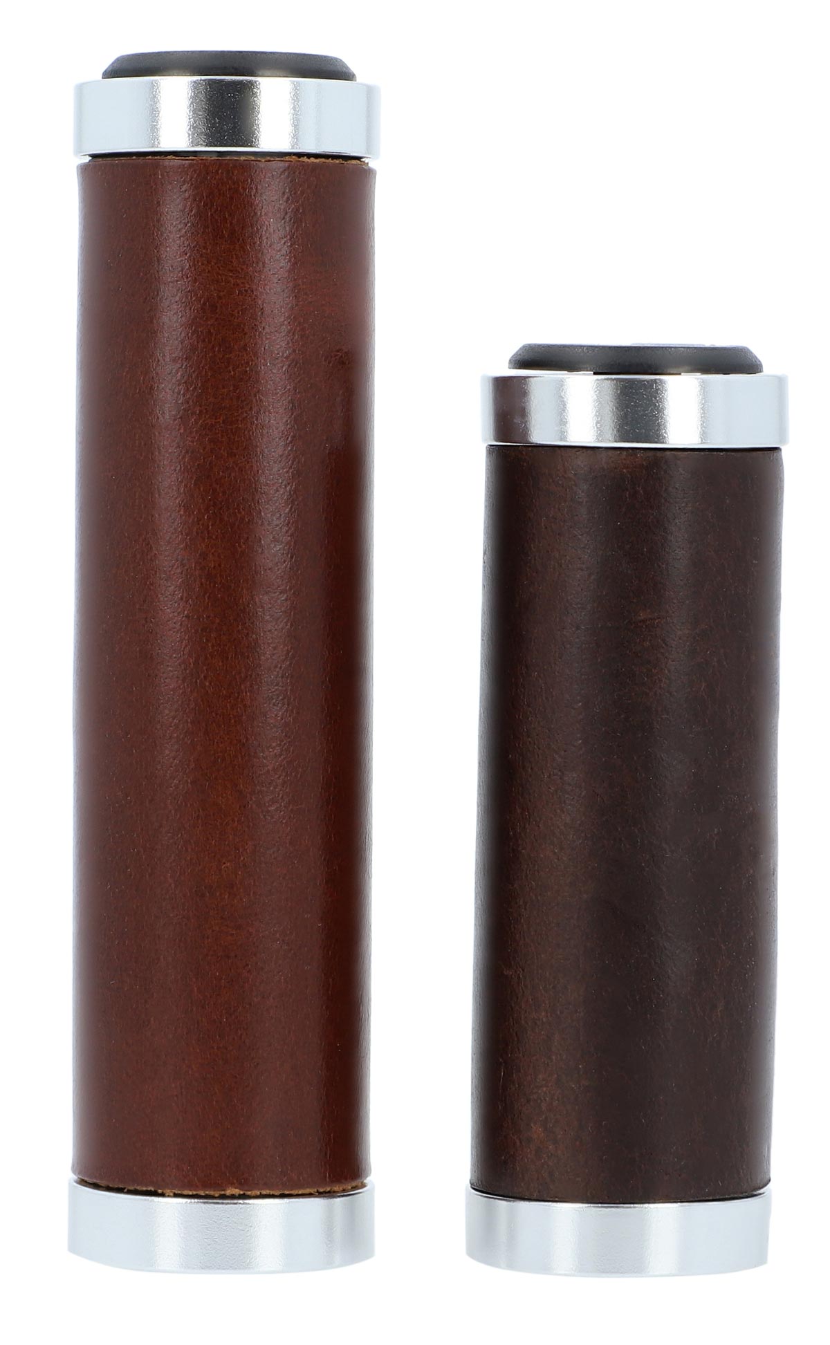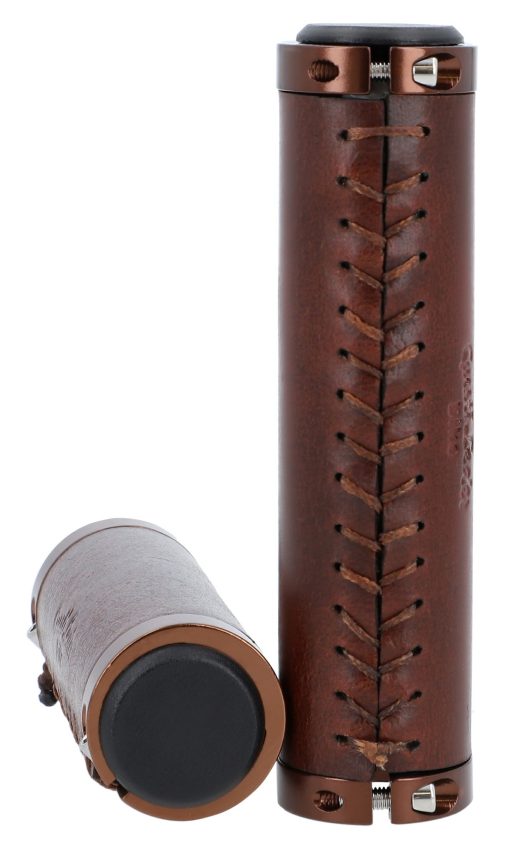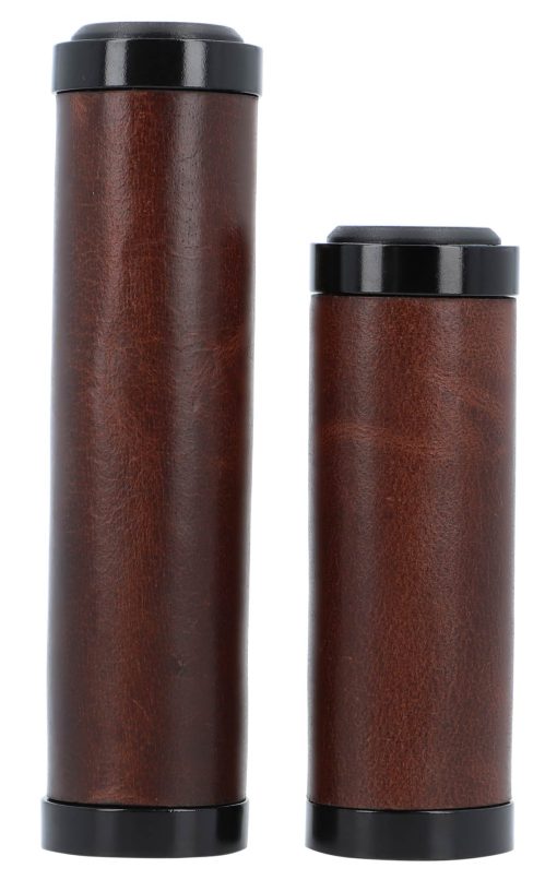 The “Aurelio G.” bicycle grips impress with their material mix of differently colored aluminum and 100% genuine leather. They consistently provide good steering behavior, no matter the surface. The robust leather ideally adapts to the anatomy of your hands over time, excellently dampens shocks and vibrations during the ride, and ensures improved grip security. This way, you always maintain control, especially in traffic.