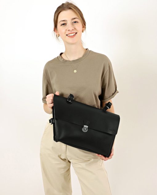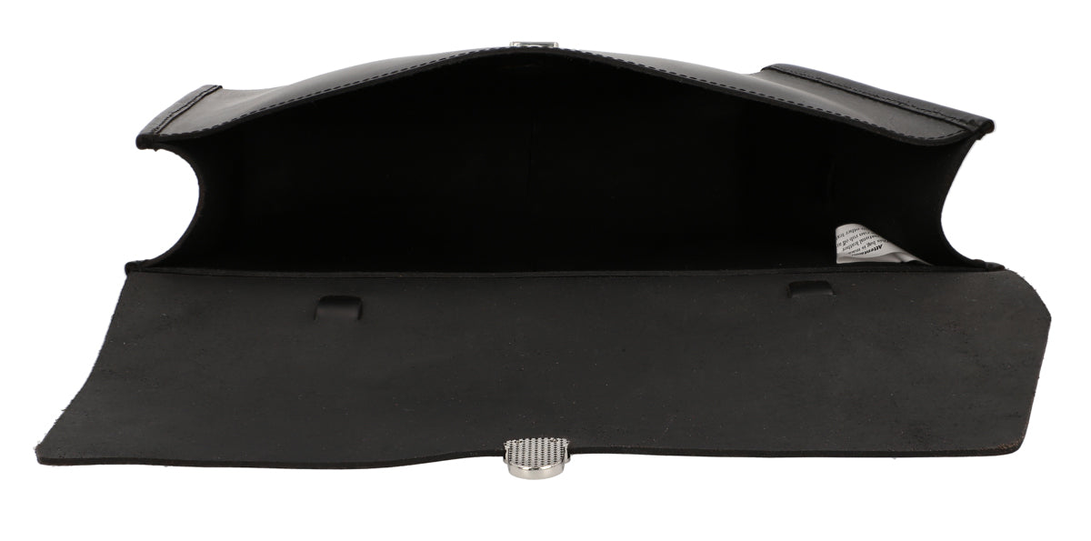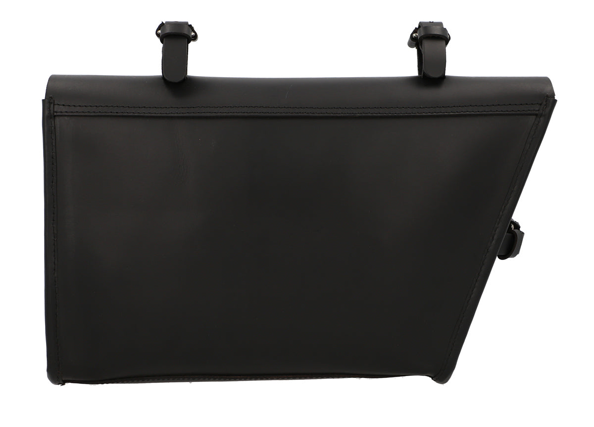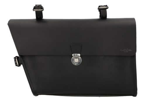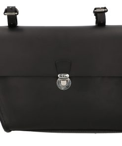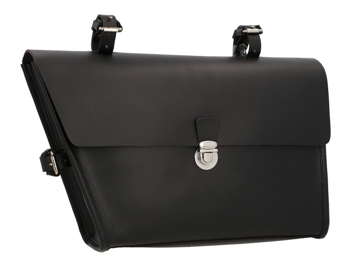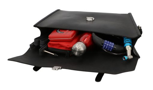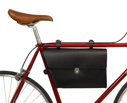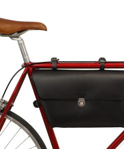 Your keys, water bottle, phone and purse are secured on the crossbar using buckles. This compact black bag will charm you with its briefcase design and silver buckle. Your new frame bag is held in place by three buckles which can withstand any type of weather. Add a classic vintage touch to your new bike with “Jef P.”.