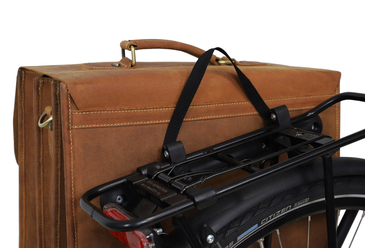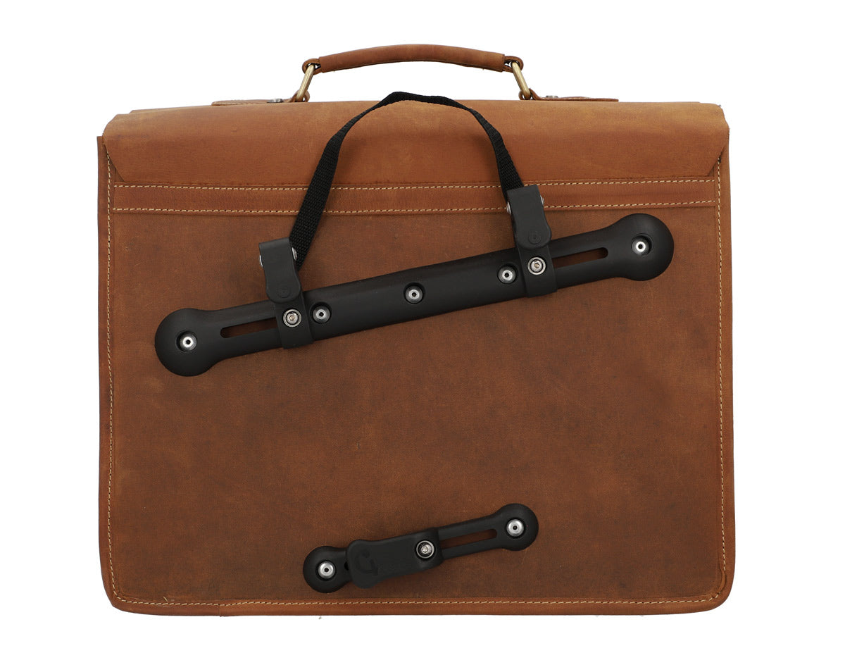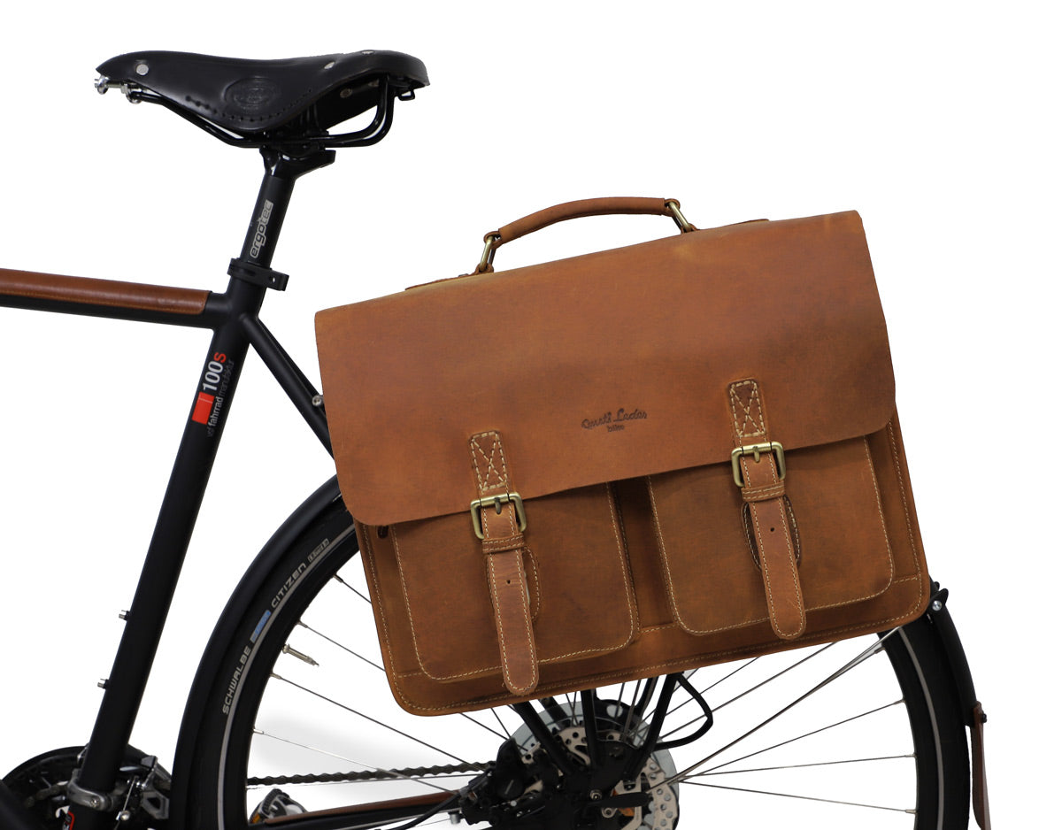 Our briefcase “Marco P.” is incredibly beautiful. This super spacious bag will charm you and turn others green with envy. But that’s not all! “Marco P.” is a true shapeshifter. You can easily mount him onto your pannier bracket, transforming him into a super chic pannier with a bold vintage flair in no time at all. This classic and elegant bag has lots of pockets and is super functional, giving you optimum freedom and flexibility when cycling to the office or in your free time. No matter if you’re going to uni, your next business meeting, walking or on your bike, “Marco P.” is a showstopper on any terrain.