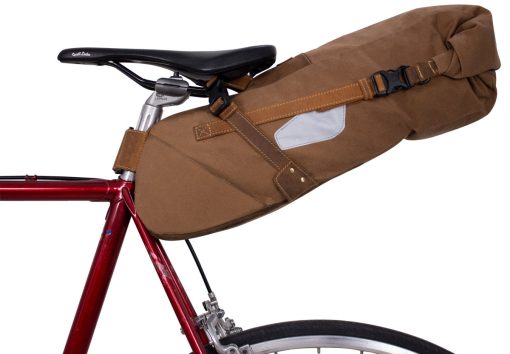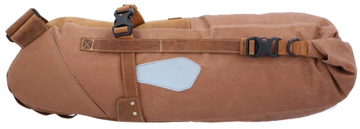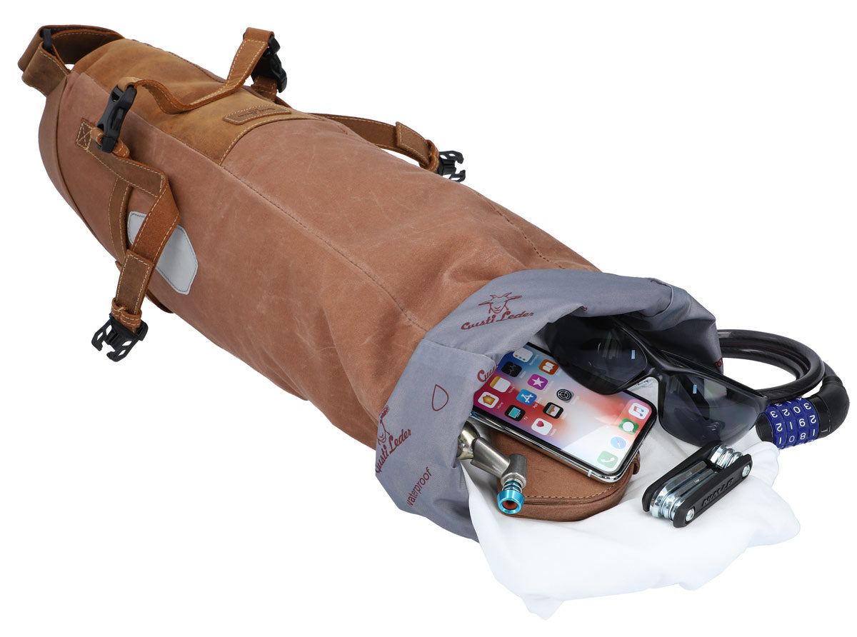 Our saddle bag saddlebag “Romain M.” provides you with lots of space so you can have everything you need on every ride. Its extra large main compartment provides plenty of space for your lock, tools, snacks, water bottle and more. The combination of canvas and high-quality buffalo leather ensures the bag is stable, while the water-resistant lining keep your gear dry – perfect for all weather conditions.